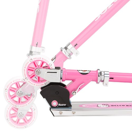 The Original A Kick Scooter is back with the new Hello Kitty theme for girls. Razor and Hello Kitty co-branded A Kick Scooter. The first in an exciting new line of Hello Kitty branded Razor scooters and electric ride-on's! Includes detachable Hello Kitty coin purse on handlebars. The Razor A is a handy little ride for kids and teens alike. Though it'll never replace the internal combustion engine, the scooter will get your child from point A to point B much quicker than on foot alone, and requires just a few scoots of one's shoes in the process. The Hello Kitty Razor A is built of aircraft-grade aluminum, a sturdy material that holds up to use and abuse through the years. Its T-tube and deck, meanwhile, fold up into a compact footprint, so riders can fit the scooter inside a bag or carry it at their side when riding isn't appropriate (it weighs around 6 pounds). And thanks to the 98mm inline-style urethane wheels, ABEC 5 bearings, and patented rear fender brake, riders will always feel smooth and in control when kicking along the sidewalk.