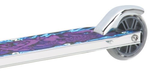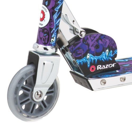 Based on the original Razor A kick scooter, the limited-edition Razor Wild Style kick scooter adds fun and exciting graffiti graphics to the frame and deck, making it ideal for everyone hip city dwellers, celebrities, businessmen, kids, and more. The Razor kick scooter was one of the most talked-about, in-demand, and best-selling items of 2000, winning the prestigious Toy of the Year award from the Toy Industry Association. Not only did the scooters catch on quickly, they also became an integral part of American culture, evolving alongside bikes and skateboards into a classic mode of transportation for kids and teens alike. The Razor Wild Style is made of aircraft-grade aluminum, a sturdy material that holds up to use and abuse through the years. Its T-tube and deck, meanwhile, fold up into a compact footprint, so riders can fit the scooter inside a bag or carry it at their side when riding isn't appropriate (it weighs around 6 pounds). And thanks to the 98mm inline-style urethane wheels (with new 14-spoke hubs), ABEC-5 bearings, and patented rear fender brake, riders will always feel smooth and in control when kicking along the sidewalk. The Razor Wild Style is recommended for ages 5 and older.